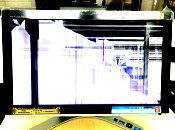 液晶画面が割れて何も見えないとのことなので破損状況を電源を入れて見てみましょう。液晶が割れているせいで画面に何が映っているのか分からない状態です。